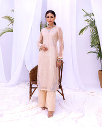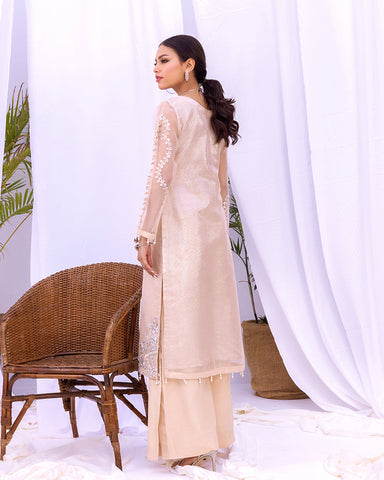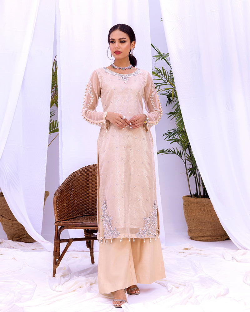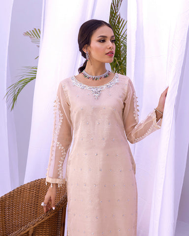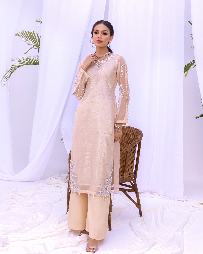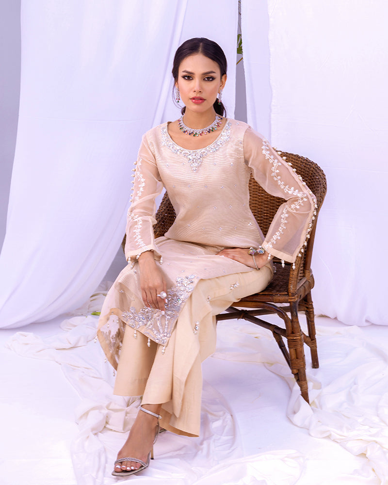 Introducing an exquisite piece of clothing, the organza embroidered shirt, meticulously crafted with delicate hand embellishments adorning the neckline and border