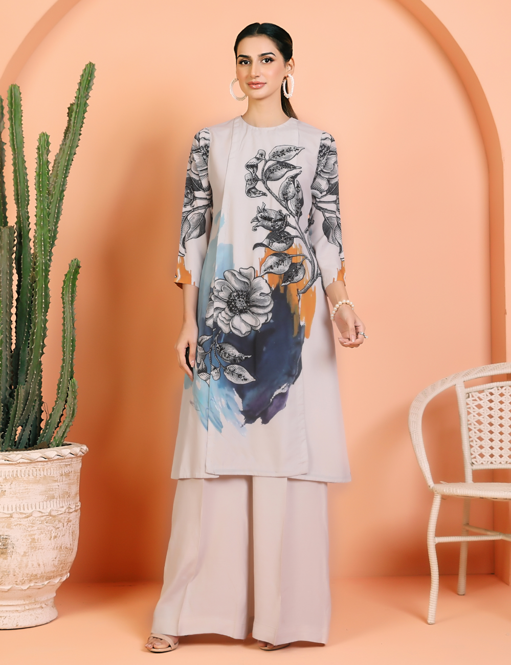 Our two-piece outfit features a Russian grip printed shirt with handcrafted embellishments and matching plazo pants, creating an opulent and luxurious look. The comfortable plazo pants offer all-day comfort, while the shirt's striking print and intricate detailing make it suitable for any occasion. This stunning outfit is sure to make a lasting impression.