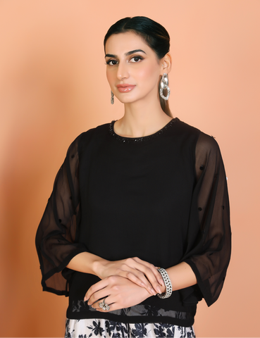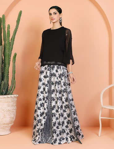 Our two-piece outfit features a hand-embellished chiffon blouse and printed raw silk skirt. Ideal for formal occasions, the outfit is both stylish and comfortable. With its intricate detailing and striking design, this outfit will make a statement and leave a lasting impression.
