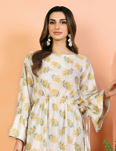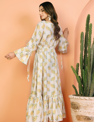 Our one-piece raw silk printed long maxi is a sophisticated and elegant outfit, adorned with handcrafted embellishments. Perfect for formal events and special occasions, this outfit is made with high-quality material for both comfort and style. The intricate detailing and unique design make it a standout addition to any wardrobe.