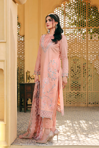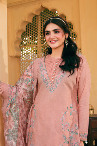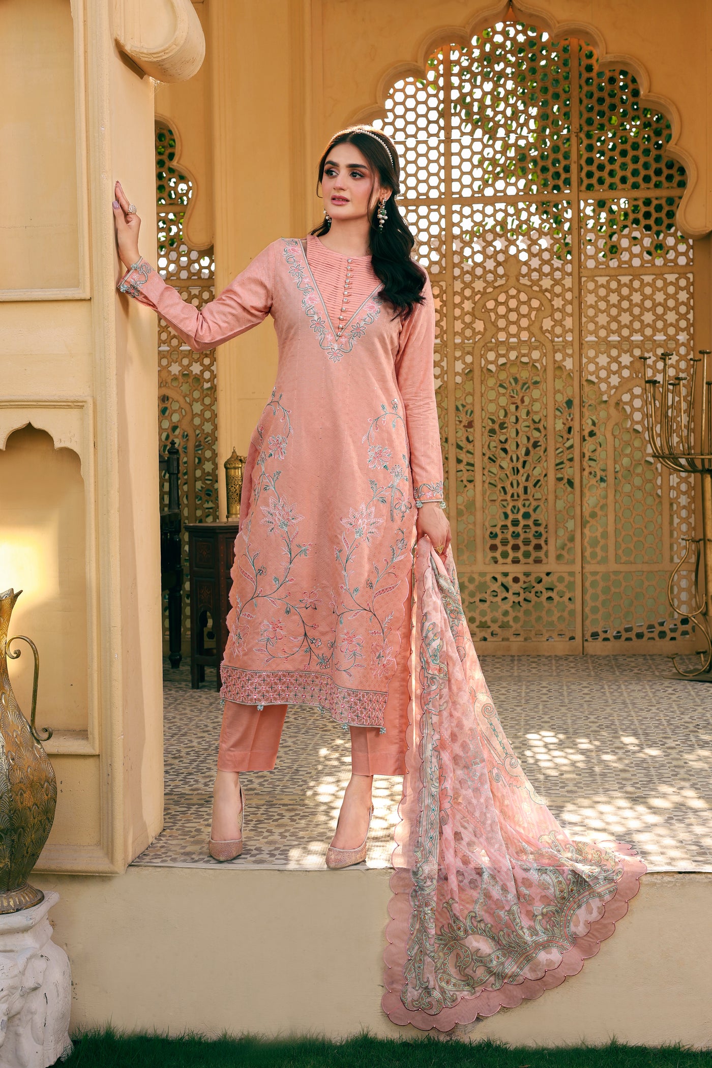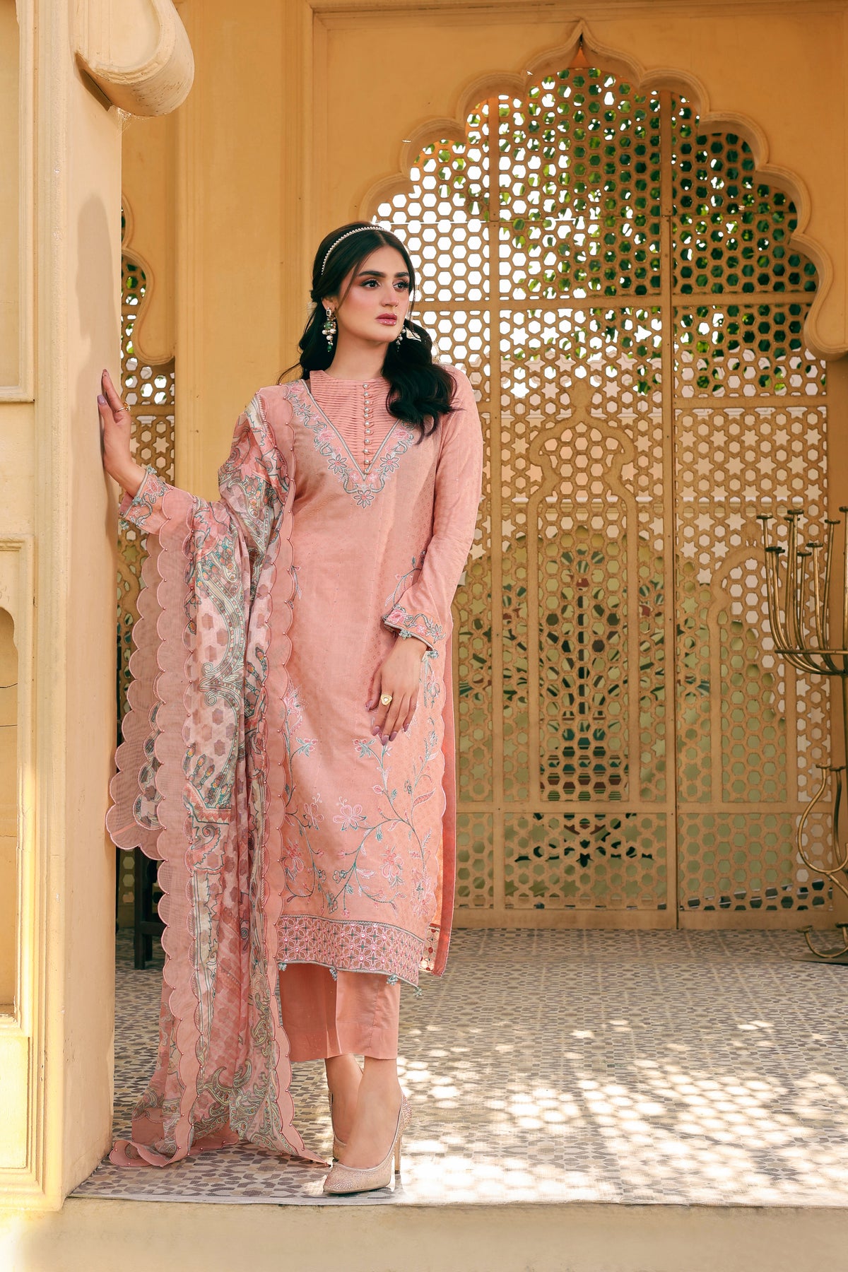 1-stunning cotton jacquard shirt! Featuring intricate sequin embroidery and pearl embellishments on the sleeves and shirt border 2-Pair it with the matching printed cotton net jacquard dupatta, which boasts organza embroidery lace and more pearls for added glamour. 3-Complete the look with the cotton trouser for a chic and sophisticated ensemble that will make you feel like a true fashionista!