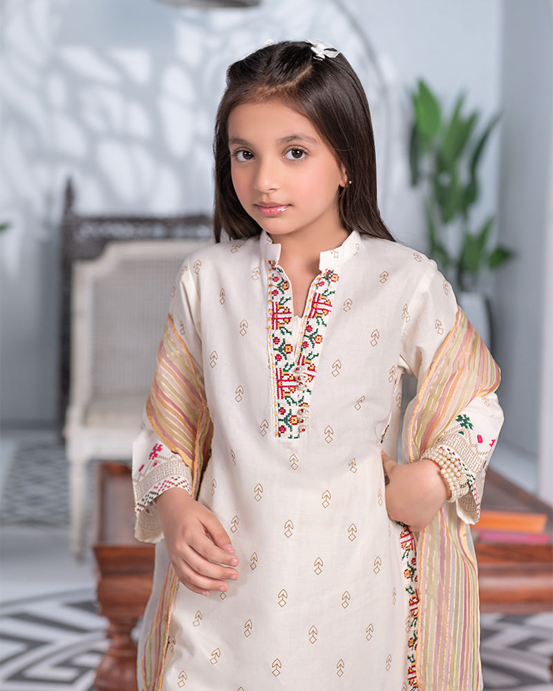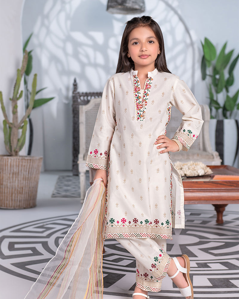 Description: COTTON SCREEN PRINT EMBROIDERED SHIRT ENHANCED WITH PEARLSCOTTON SCREEN PRINTED TROUSERORGANZA PRINTED DUPATTA WITH PEARLS