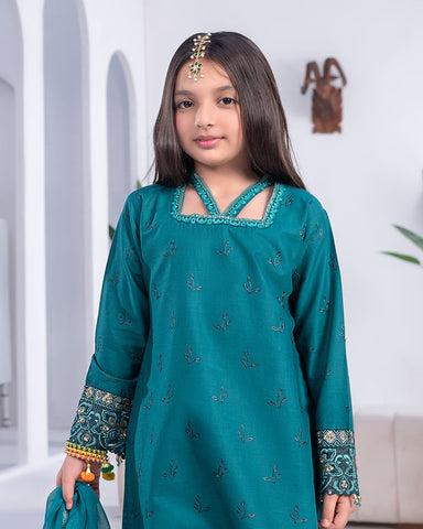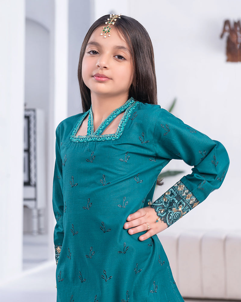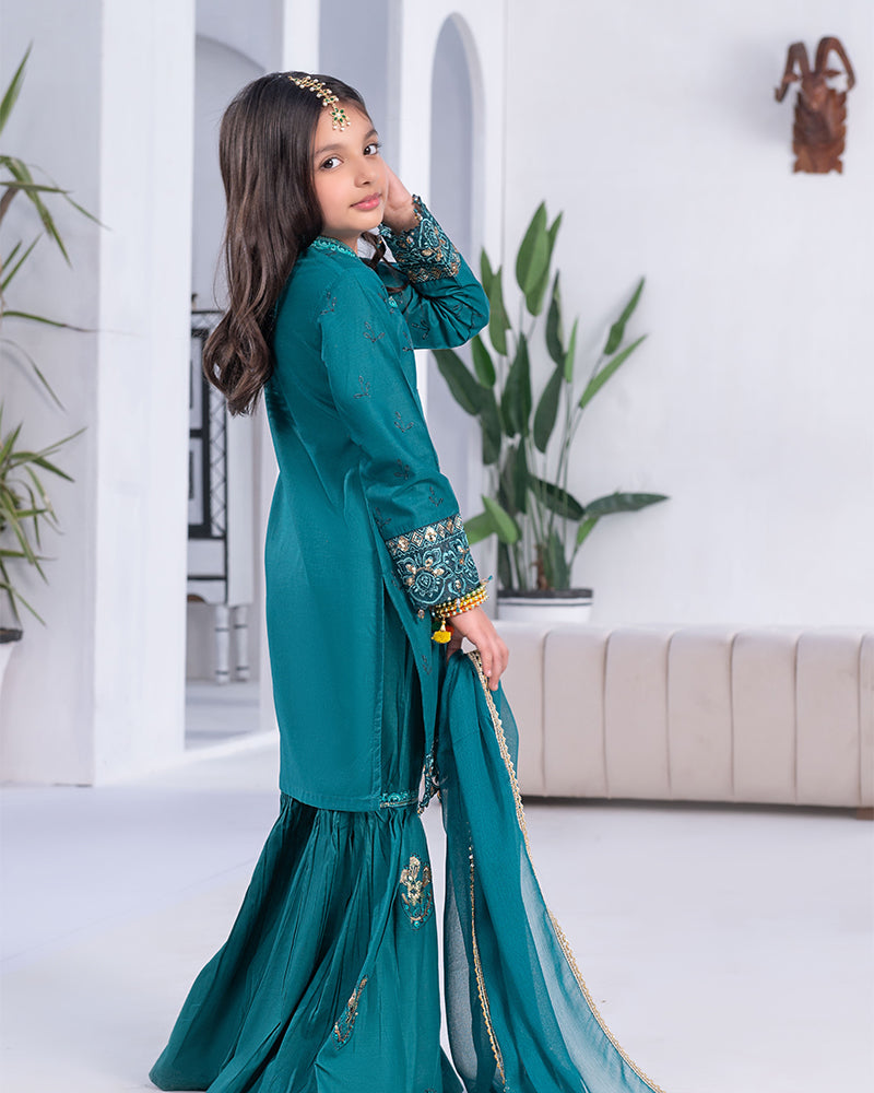 Description: COTTON EMBROIDERED SEQUIN SHIRT ENRICHED WITH PEARLSCHIFFON DUPATTA WITH FOUR SIDE BOARDER LACECOTTON EMBROIDERED SEQUIN SHARARAH