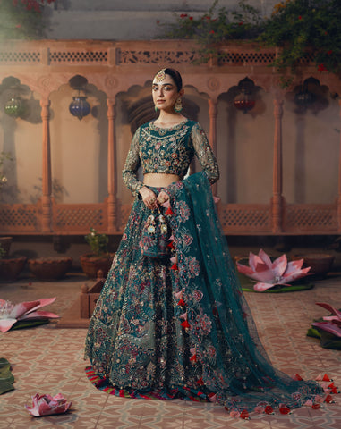 Net Embroidered Choli: The 'Rung' choli is a masterpiece of meticulous craftsmanship, featuring an intricate blend of dazzling elements including dabka, naqshi, sequins, chain work, sea shells, crystal embellishments, and pearls. This exquisite garment is designed with a luxurious viscose inner lining, ensuring both elegance and comfort.