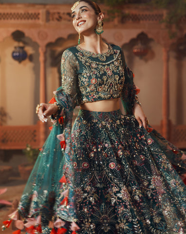 Embroidered Lehenga: The lehenga is elegantly embroidered with heavy crafted work, including dabka, sequin chain work, sea shells, crystal accents, and pearls. Paired with a chic viscose digital printed inner fabric, it adds an extra layer of flair and sophistication, ensuring you turn heads wherever you go.