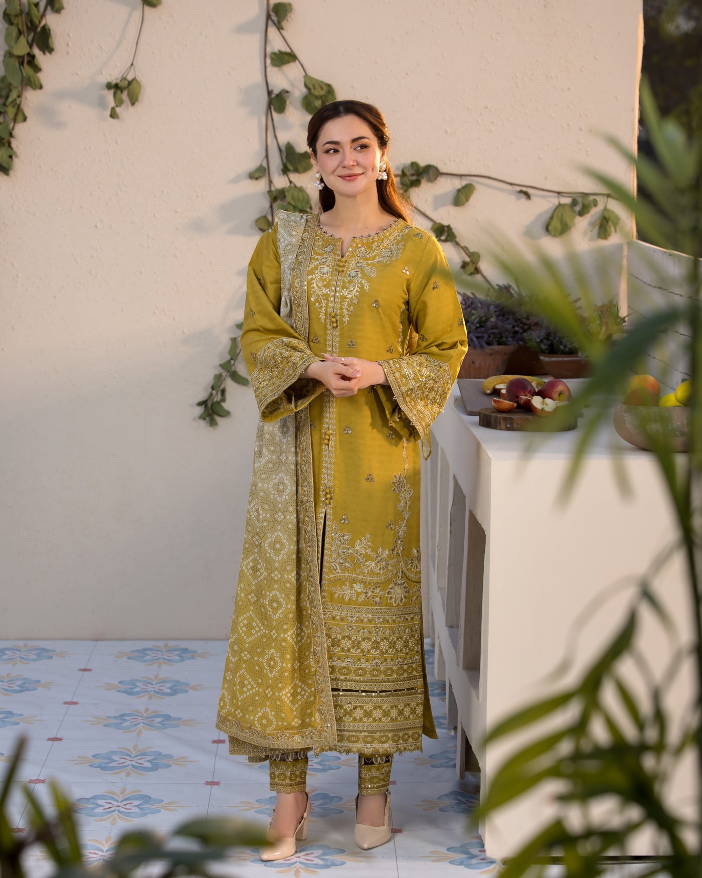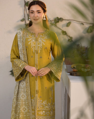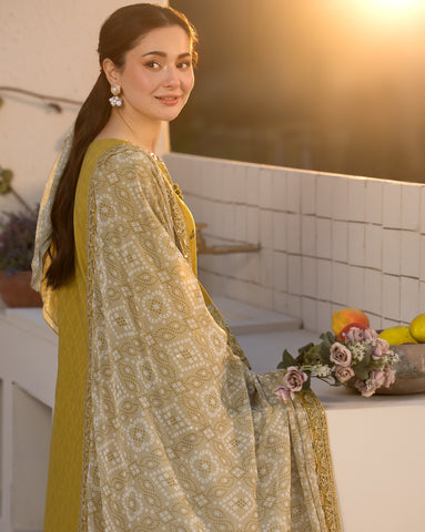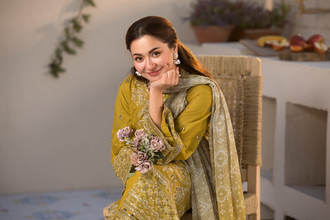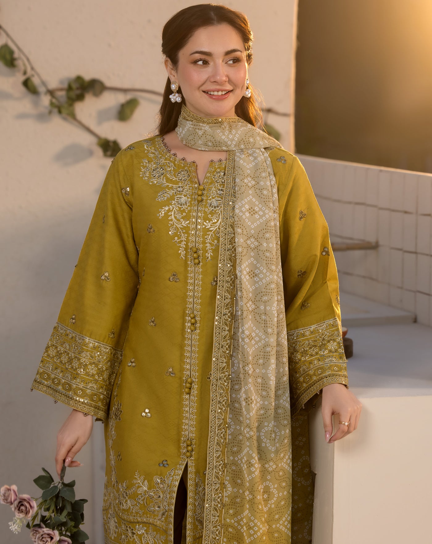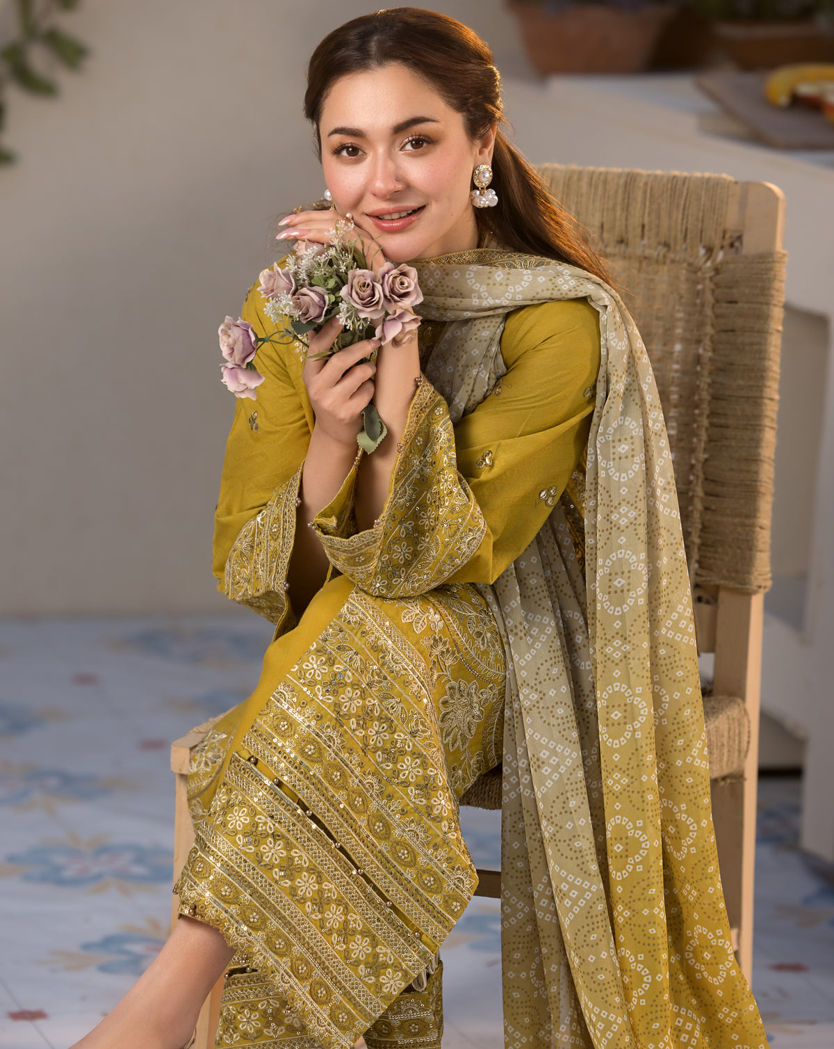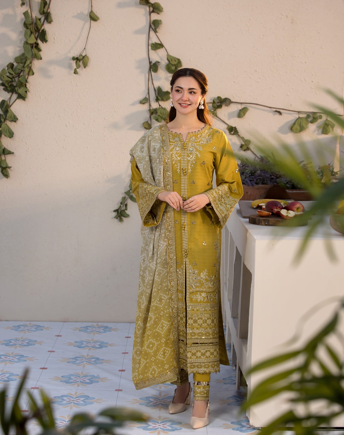 Chiffon Chunri Printed Dupatta: The dupatta is made from delicate chiffon with a traditional chunri print, complemented by intricate sequin embroidery. The print adds a timeless charm, while the sequins bring a touch of sparkle and sophistication.