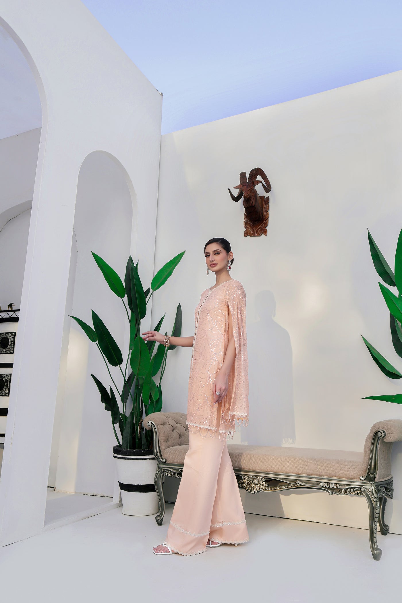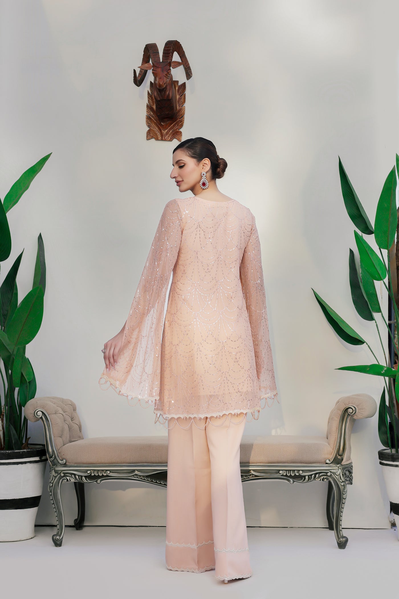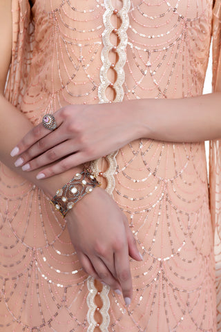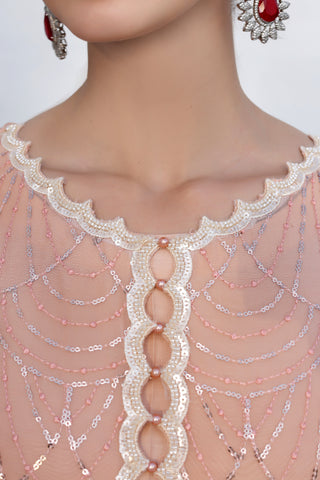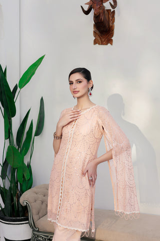 Introducing our stunning chiffon sequin embroidered shirt, complete with matching pearl tassels adorning the shirt border and sleeves. This exquisite piece also features an attached viscose inner for added comfort and style