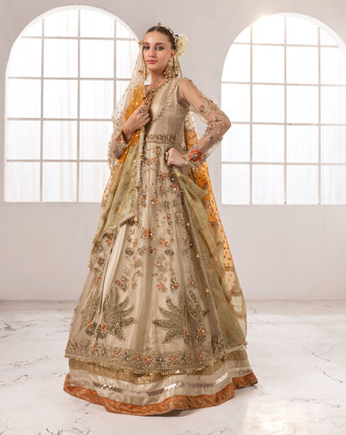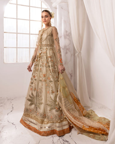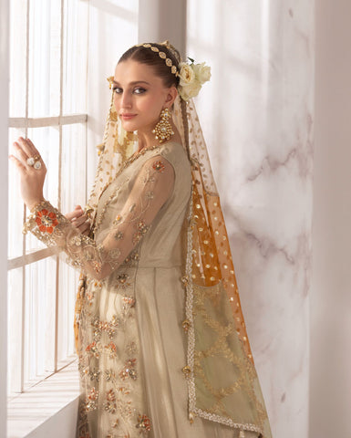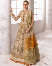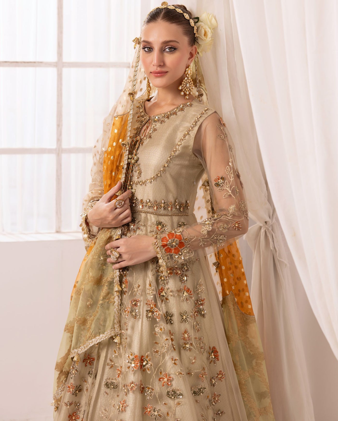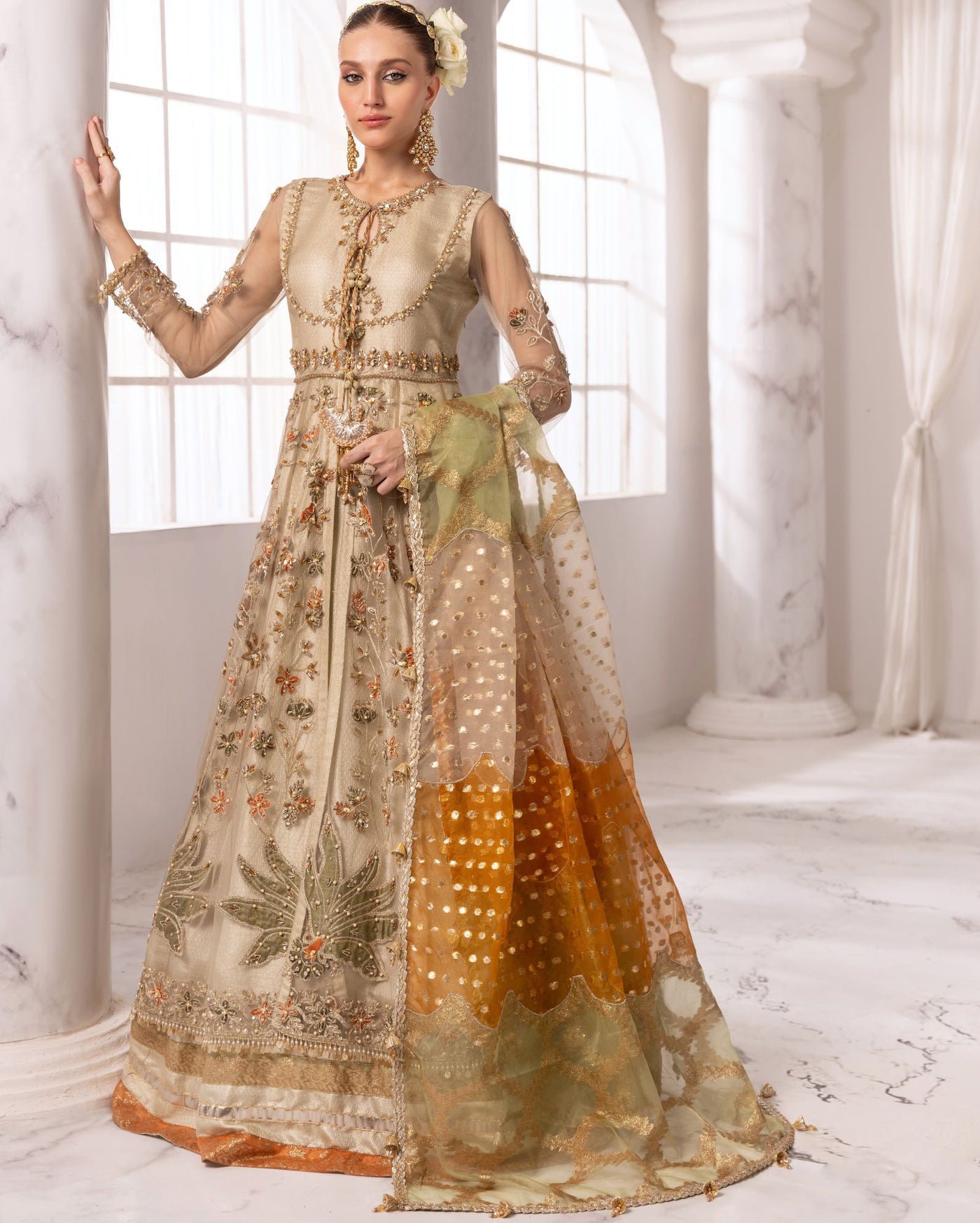 Organza Embroidered Front Open Maxi: Behold the exquisite beauty of this maxi, adorned with intricate handcrafted adda work and delicate pearls. The addition of beautiful tassels enhances its allure, while the inner lining of luxurious jamawar fabric adds a touch of elegance.