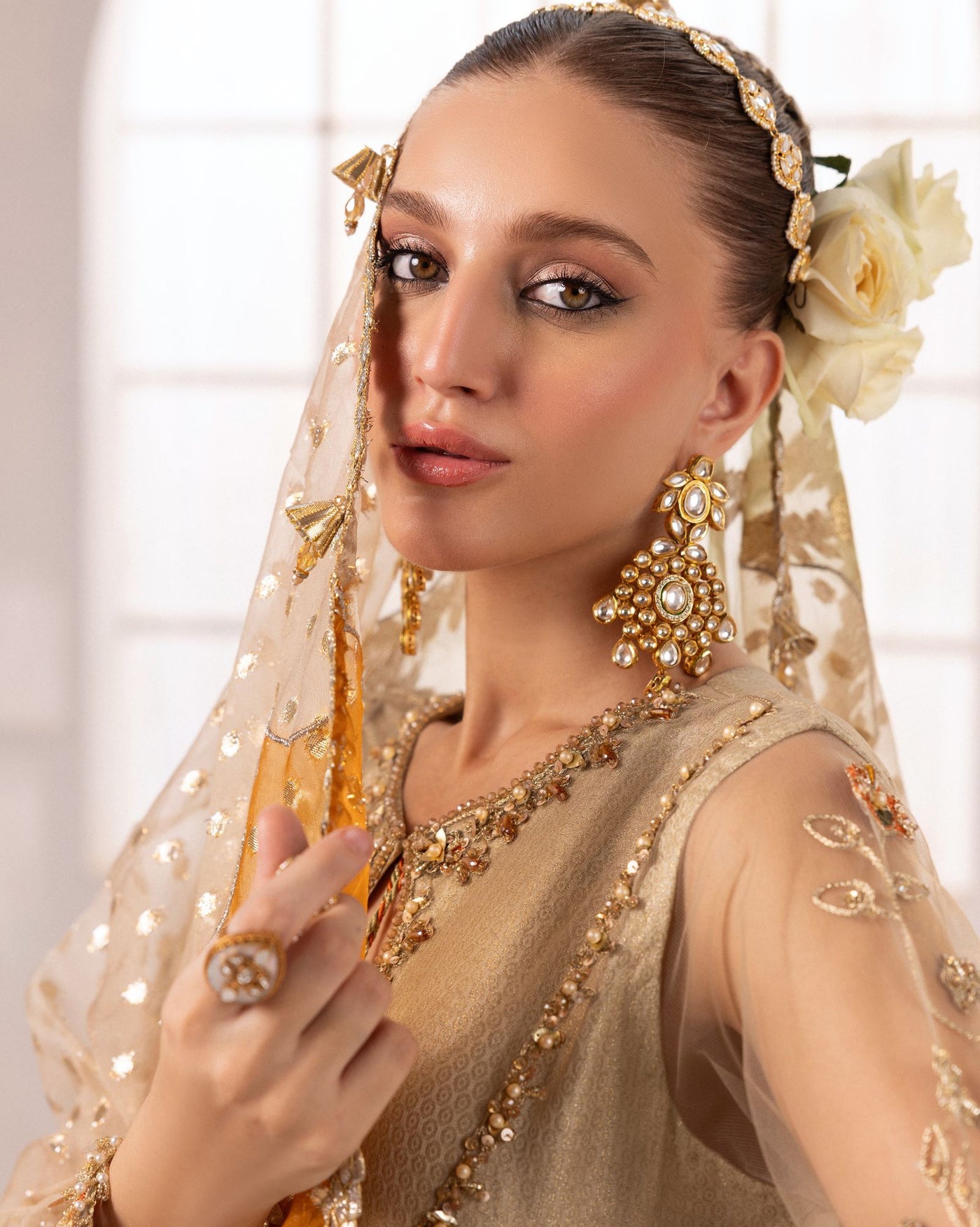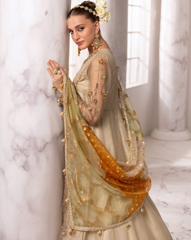 Organza Jacquard Lurex Dupatta: Completing this stunning ensemble is the organza (three-colored) jacquard lurex dupatta, featuring lace detailing and tassels on the sides.
