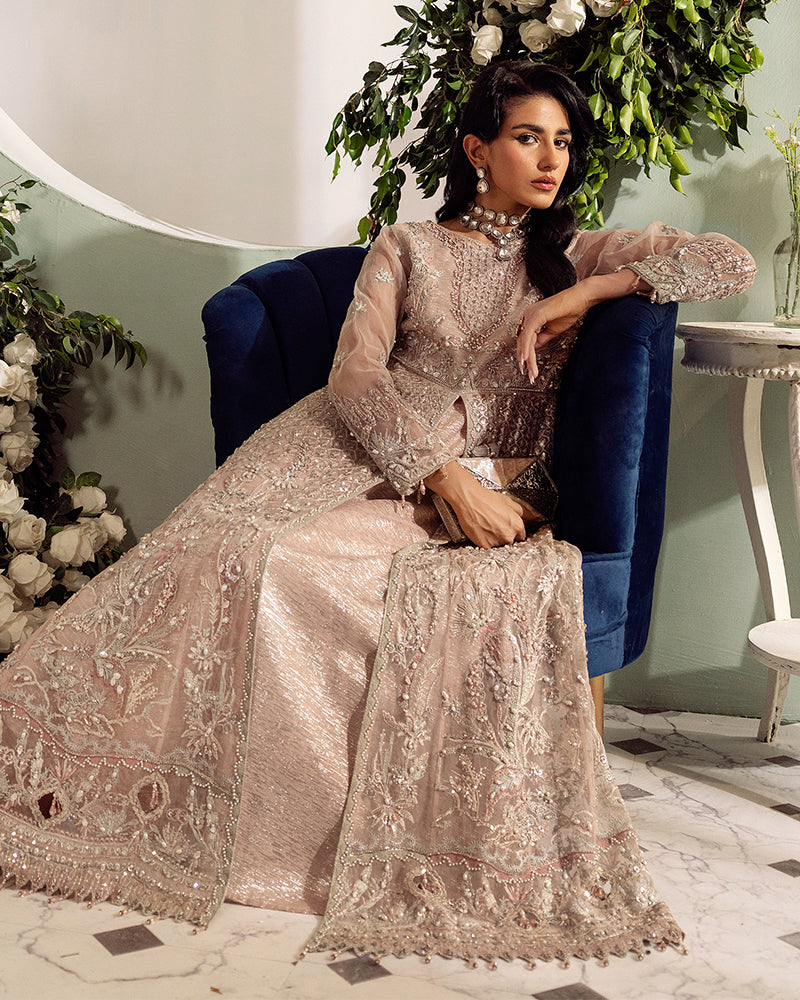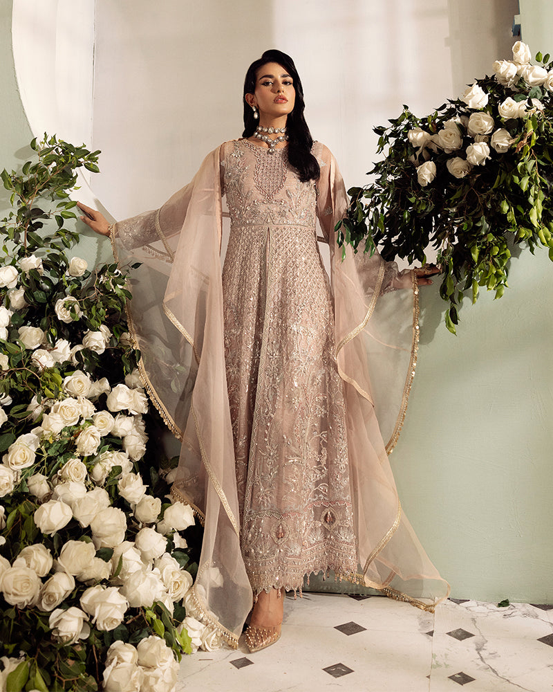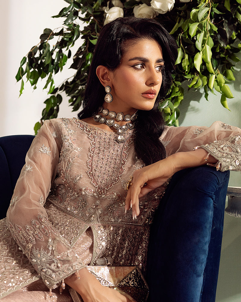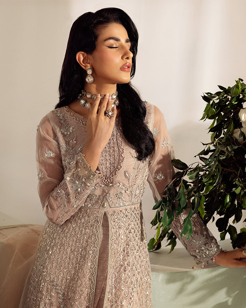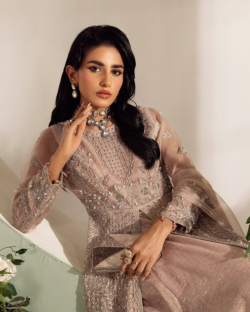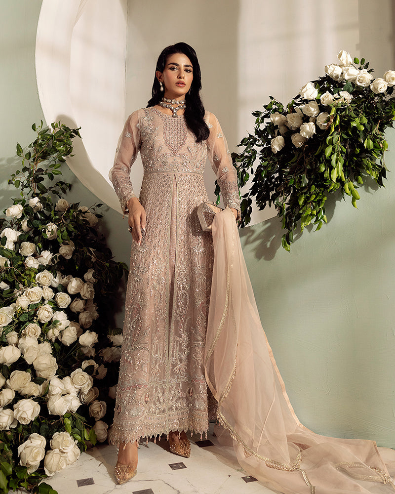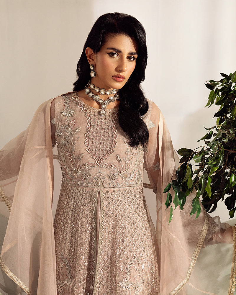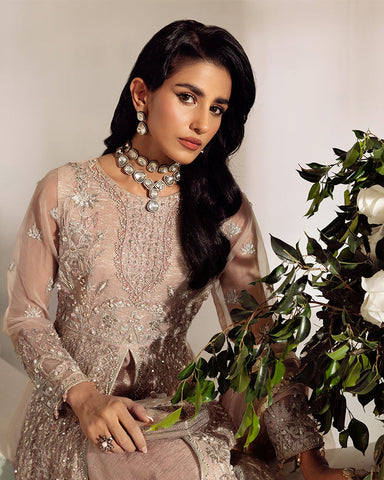 Description: 1-Organza embroidered front open maxi enhanced with hand crafted adda work 2-Organza layered dupatta stitched with laces 3-Viscose trouser its 3pcs stitched outfit