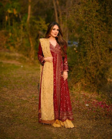 Chiffon Embroidered Maxi: This stunning maxi dress is enhanced with intricate hand-crafted adda work, adding a touch of luxury and elegance to your look.