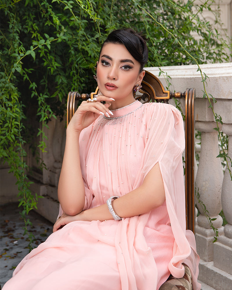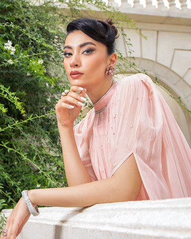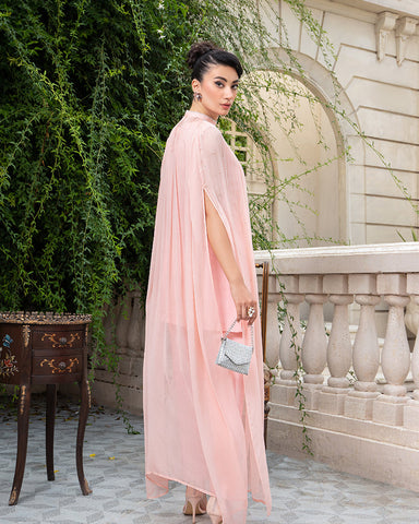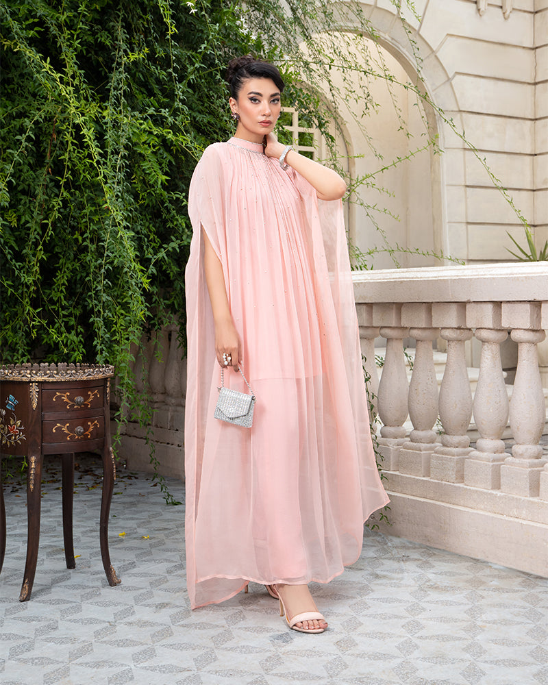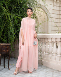 Description: Introducing our stunning chiffon cape now with an exquisite hand-embellished diamante sprayStylish viscose-dyed trousers2 pcs stitched outfitShirt Length: 47 INCHES