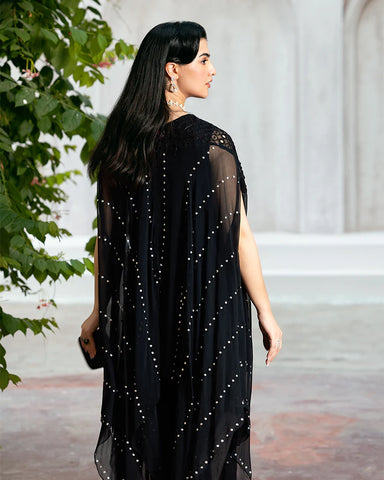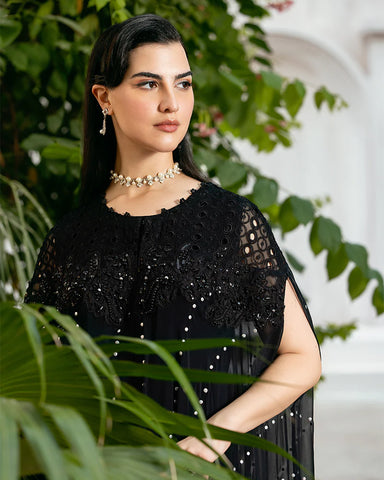 1-chiffon chikankari cape, adorned with intricate handcrafted embellishments and dazzling mukesh work.Don't miss out on this must-have addition to your wardrobe!"