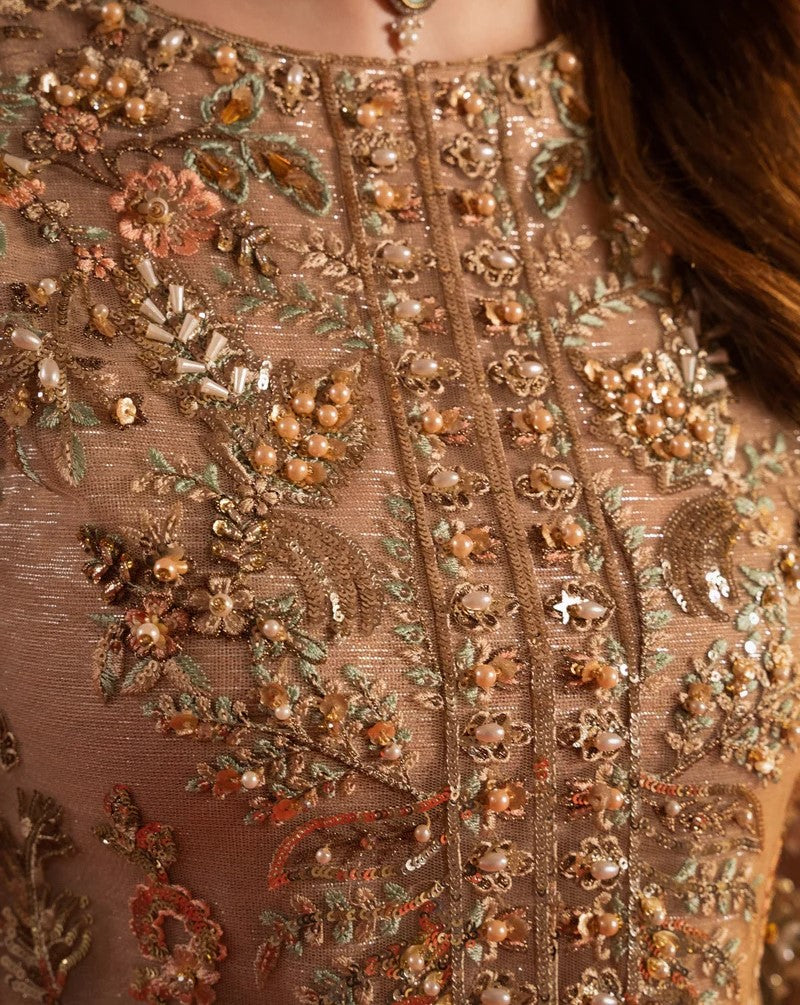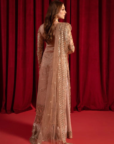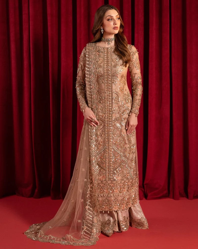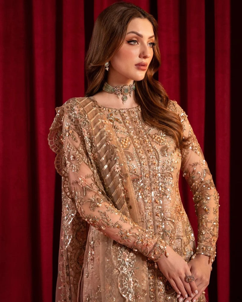 Matching Net Sequin Embroidered Dupatta: The matching dupatta, crafted from net and adorned with exquisite sequin embroidery, adds an extra touch of sophistication. Its graceful drape enhances the overall elegance of the ensemble, making it perfect for any special occasion.