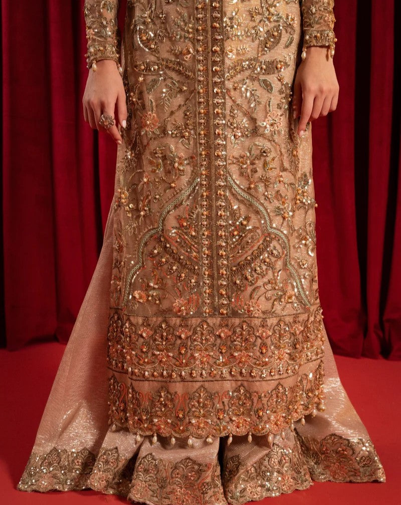 Shimmer Sequin Embroidered Shararah: Completing the look is a breathtaking shimmer sequin embroidered shararah, which adds a playful flair to the outfit. This exquisite piece ensures you’ll turn heads and leave a lasting impression wherever you go!