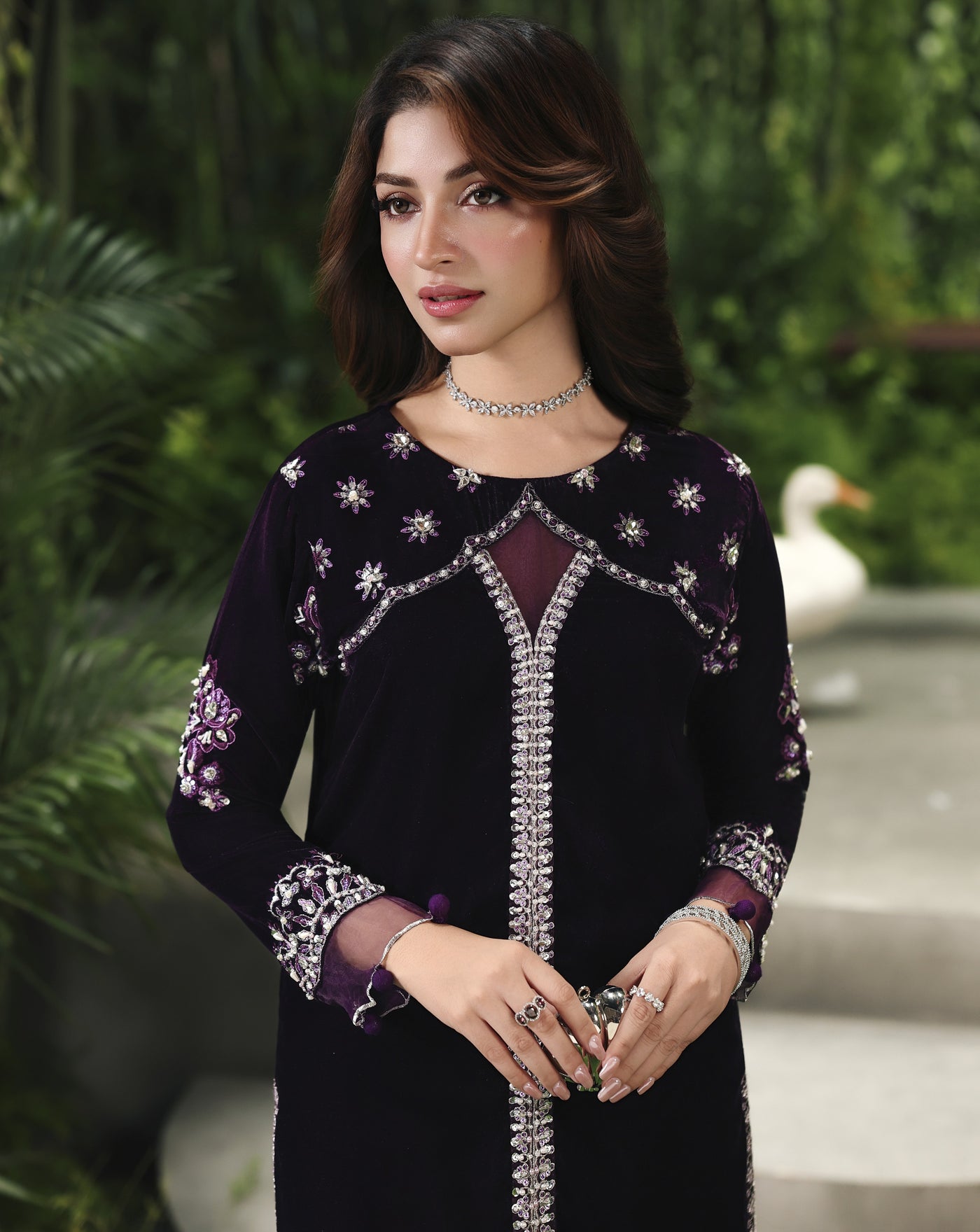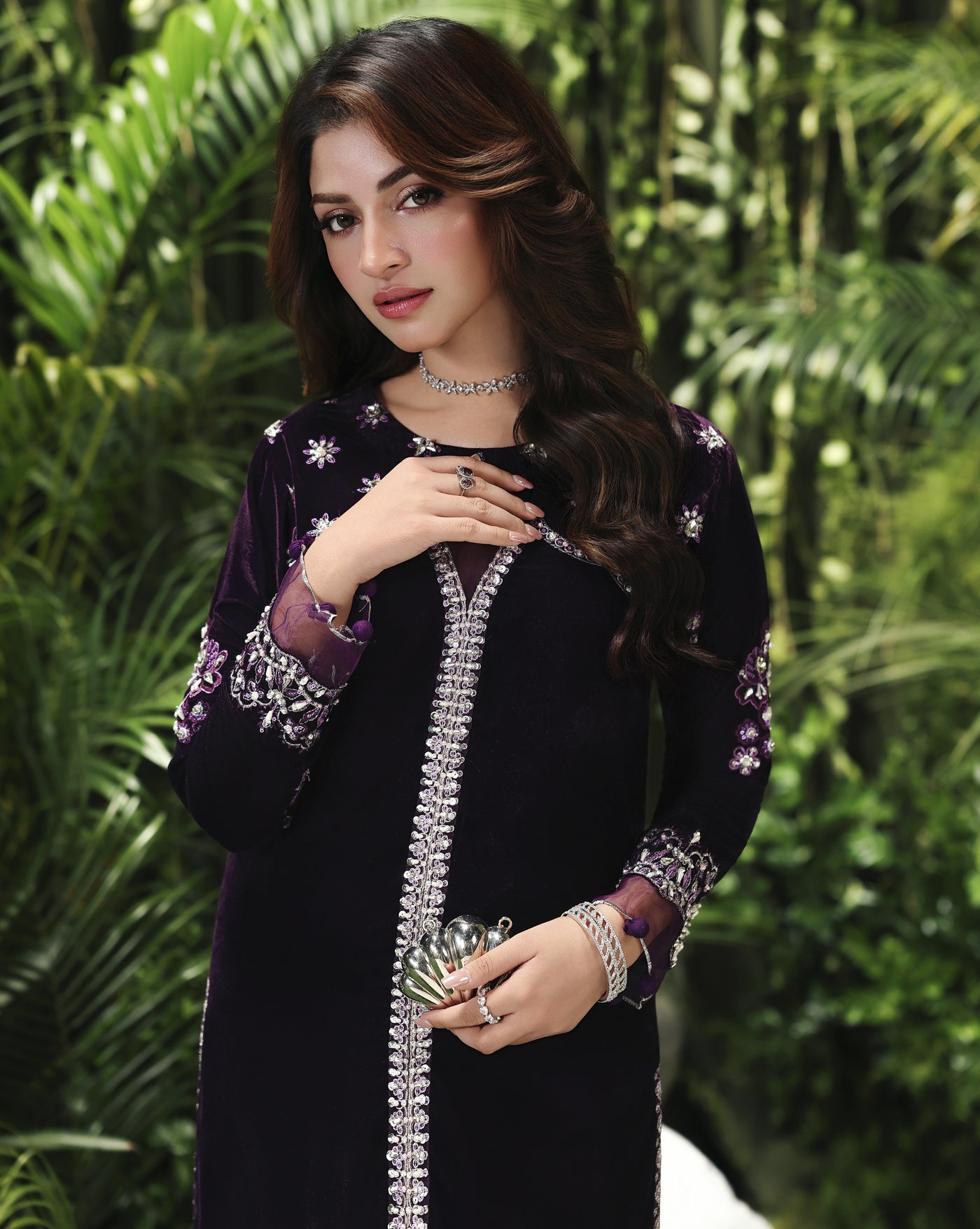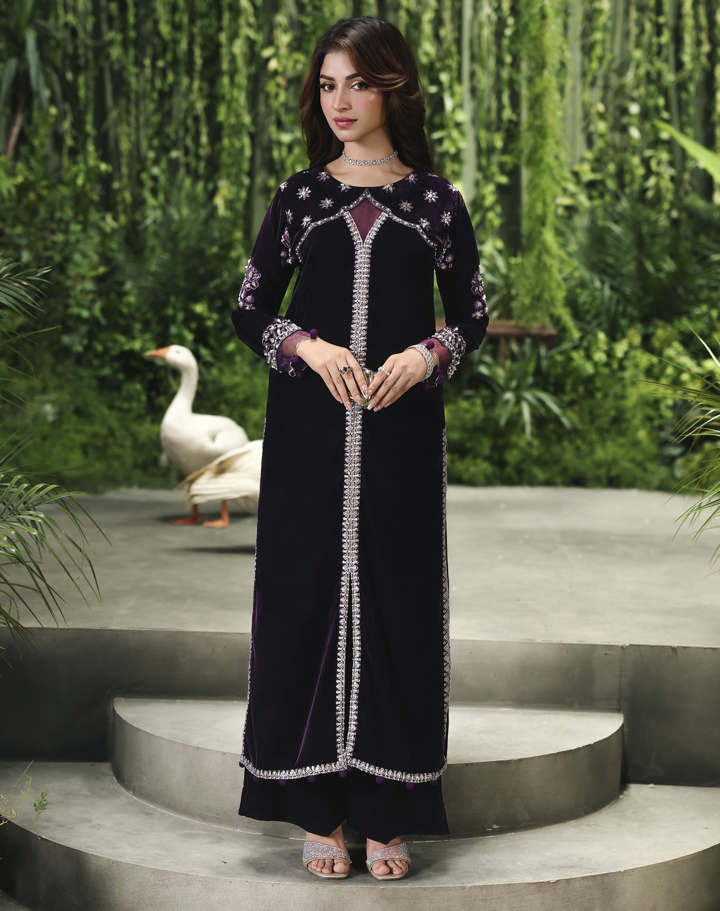 Paired with velvet trousers, this ensemble combines sophistication, texture, and glamour — perfect for festive soirées and grand celebrations.