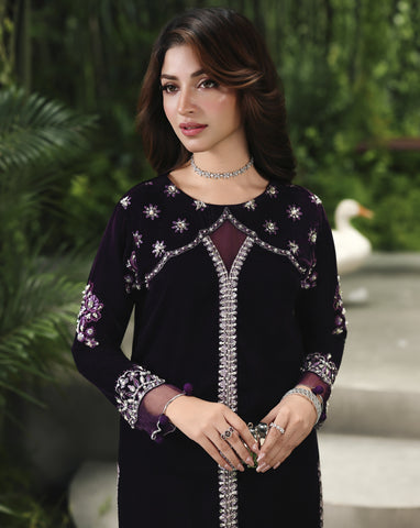 The velvet shirt is adorned with dazzling embroidery, shimmering pearls, sparkling stones, and radiant crystals, all beautifully enhanced with intricate cutdana work for a rich, regal finish.