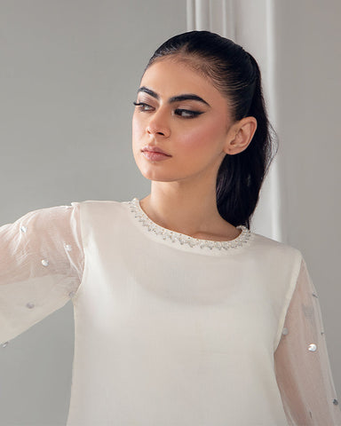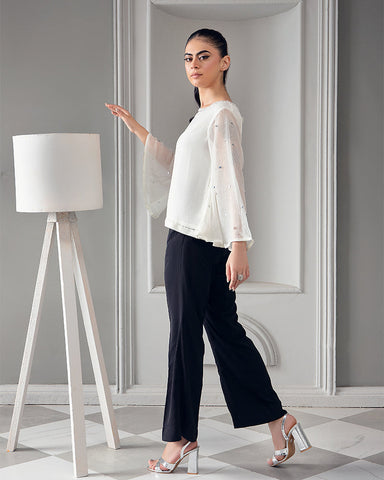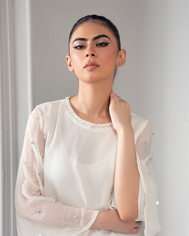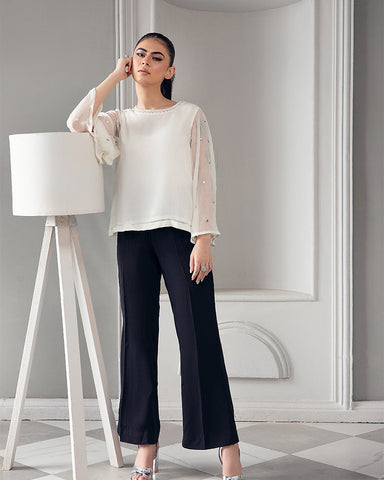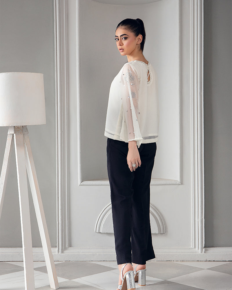 A hand-embellished chiffon blouse ideal for formal occasions, the outfit is both stylish and comfortable. With its intricate detailing and striking design, this outfit will make a statement and leave a lasting impression.