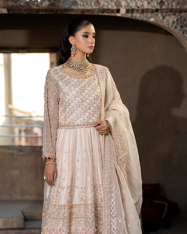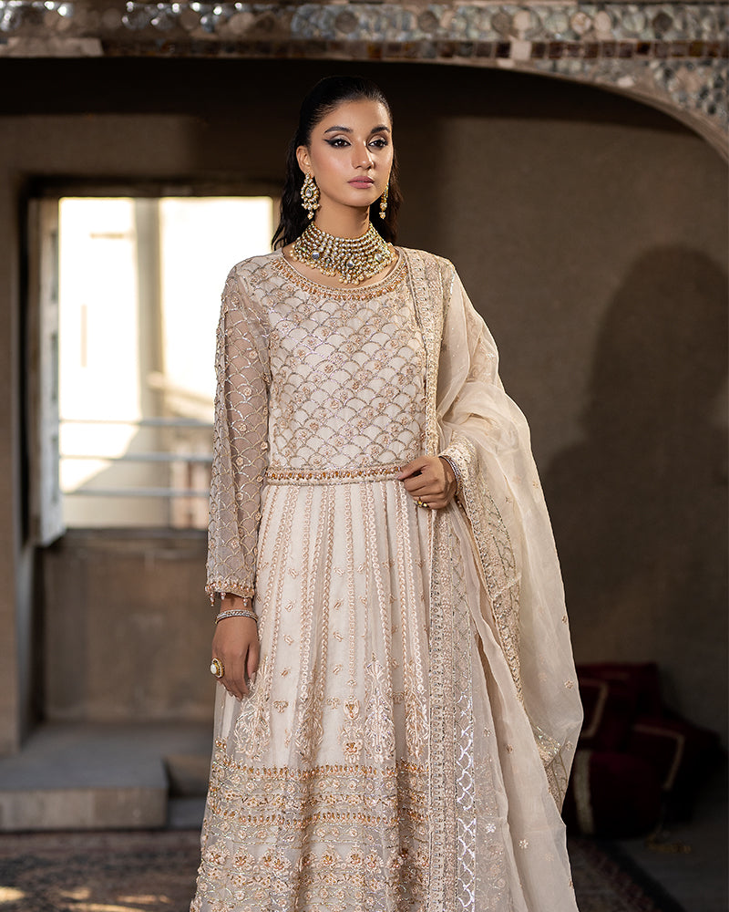 Organza Embroidered Maxi, enhanced with mesmerizing 3D embellishments, shimmering Sewroshki pearls, and delicate sequins