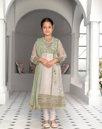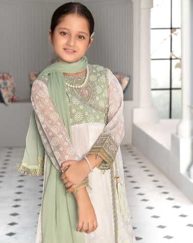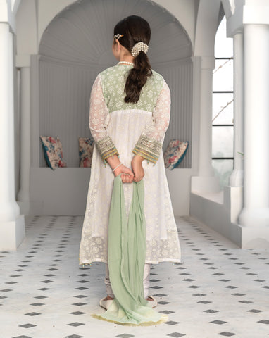 Behold the exquisite chiffon sequin self-printed Angrakha-style front-open maxi, adorned with delicate pearl embellishments.