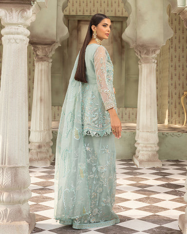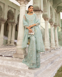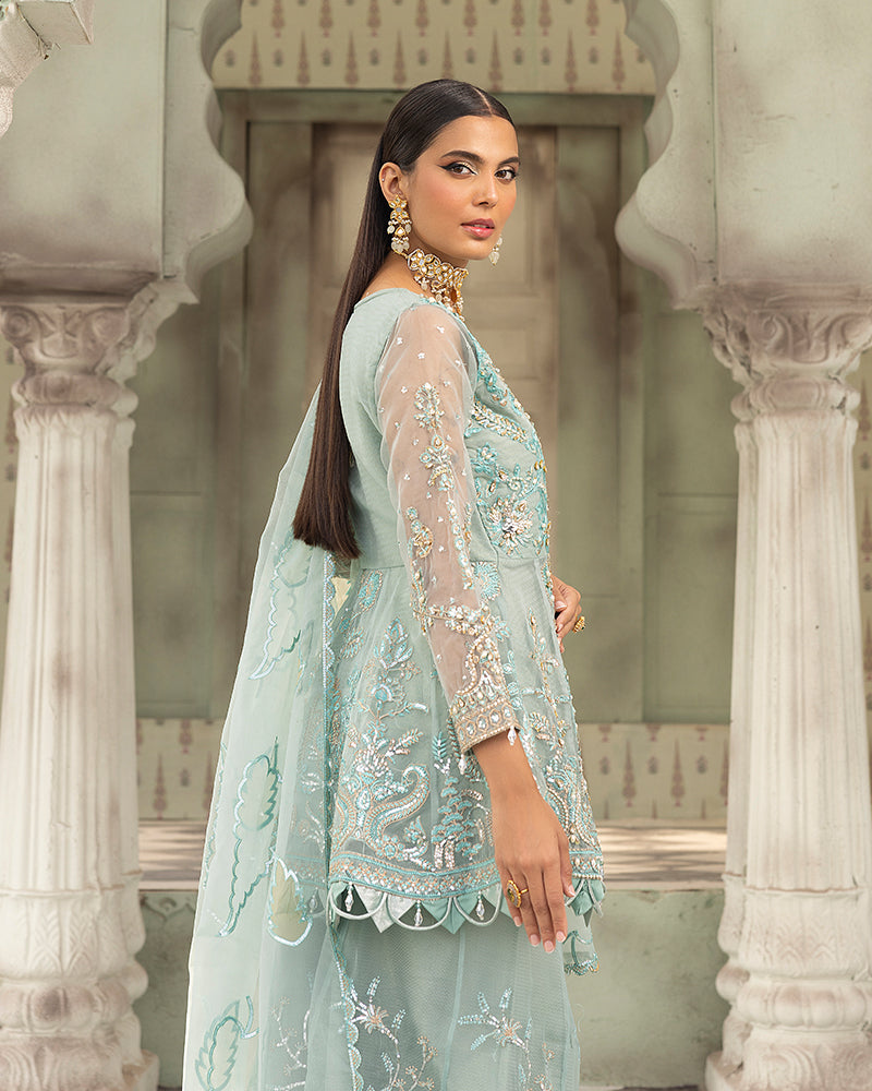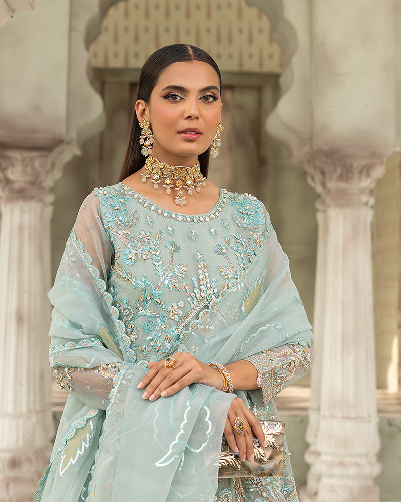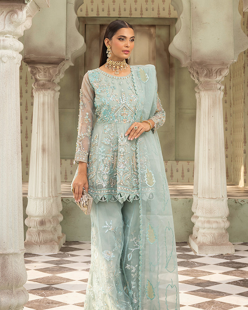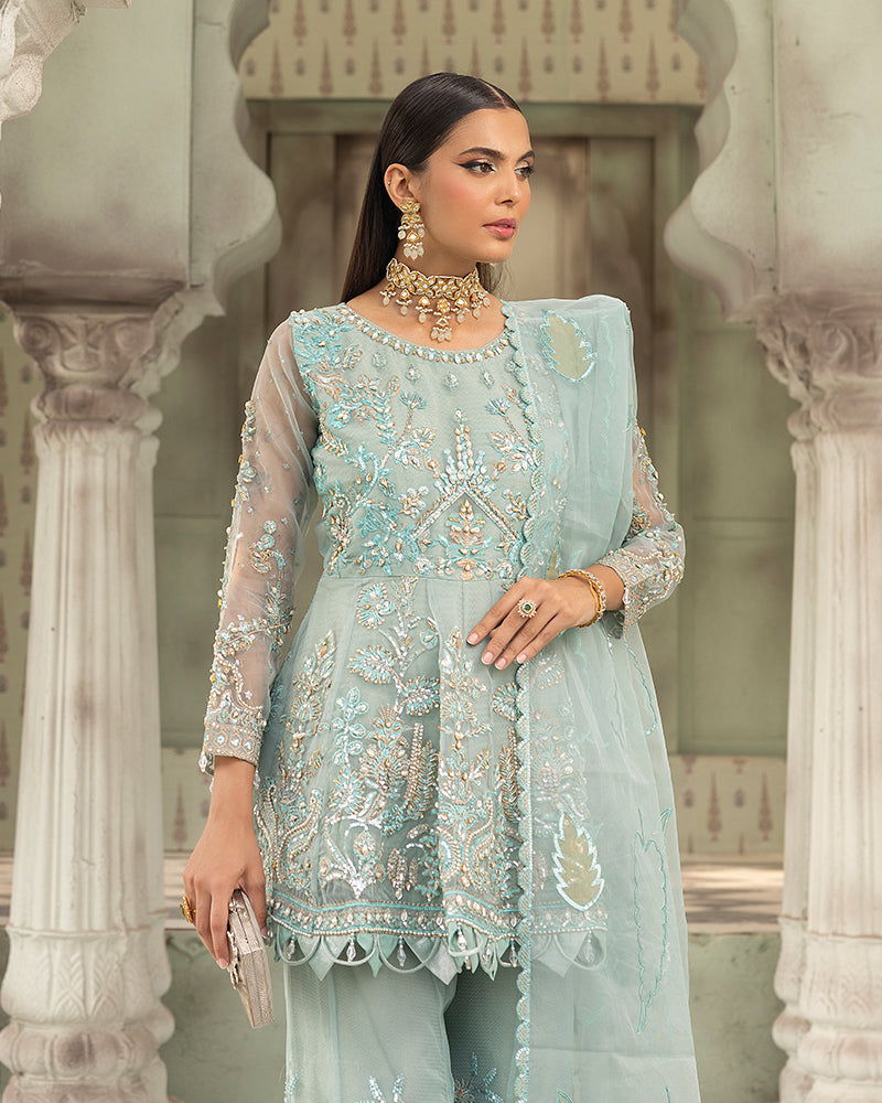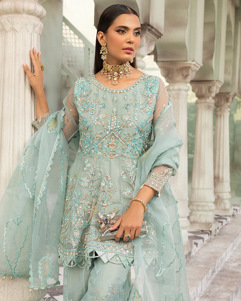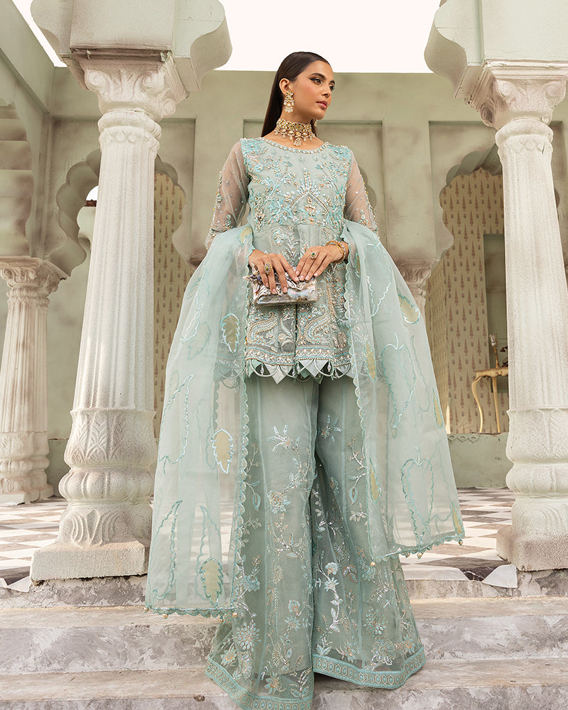 Description: 34 Inches Organza embroidered peplum enhanced with hand crafted adda work 2-Organza embroidered dupatta with aplic work 3-Organza embroidered panel shararah Its 3pc stitched outfit.