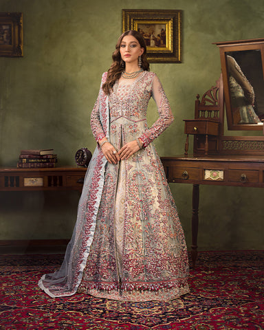 Introducing our stunning and exquisite net embroidered front open maxi, meticulously enhanced with intricate hand embellishments and a mesmerizing spray of pearls on the back bodice.