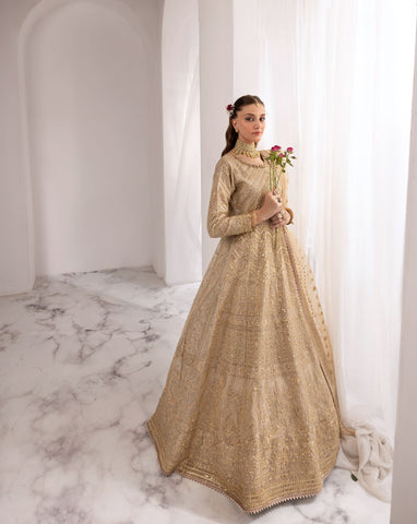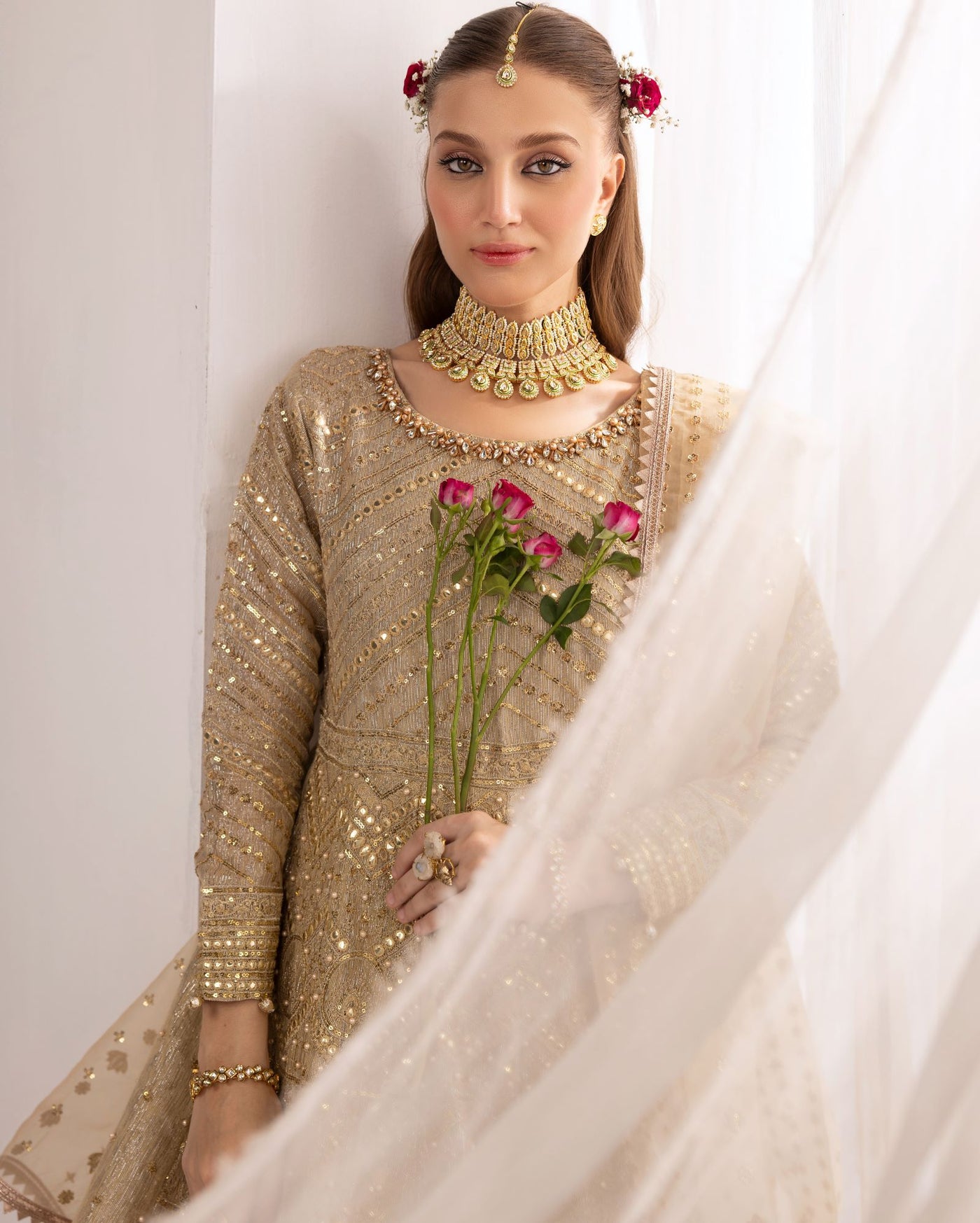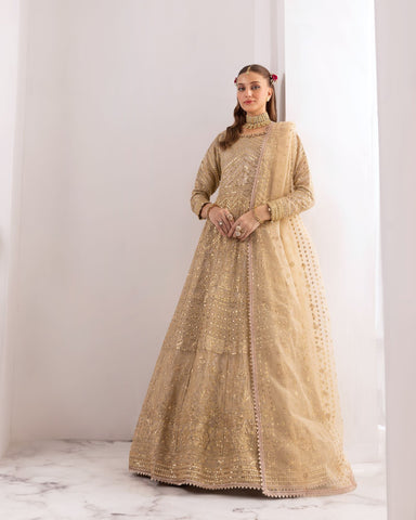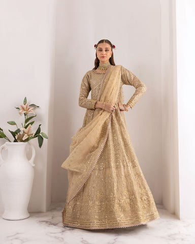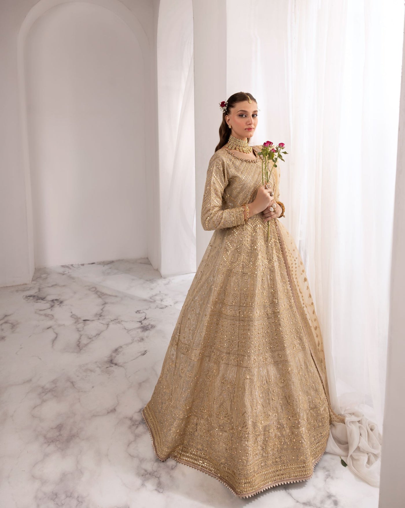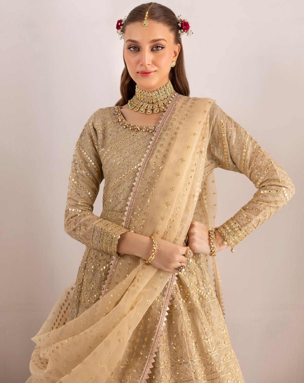 Zari Masoori Net Embroidered Maxi: This stunning maxi dress features handcrafted adda work on the neckline and is embellished with matching pearls, adding a touch of elegance and sophistication.